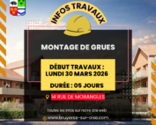 Dans le cadre du chantier de construction de 84 logements et d'un pôle médical, rue de Morangles, l'entreprise Eiffage Construction procédera au montage de deux grues à partir du lundi 30 mars 2026 et ce pendant 5 jours. Cette intervention est susceptible d'occasionner quelques nuisances dans le secteur. [...]