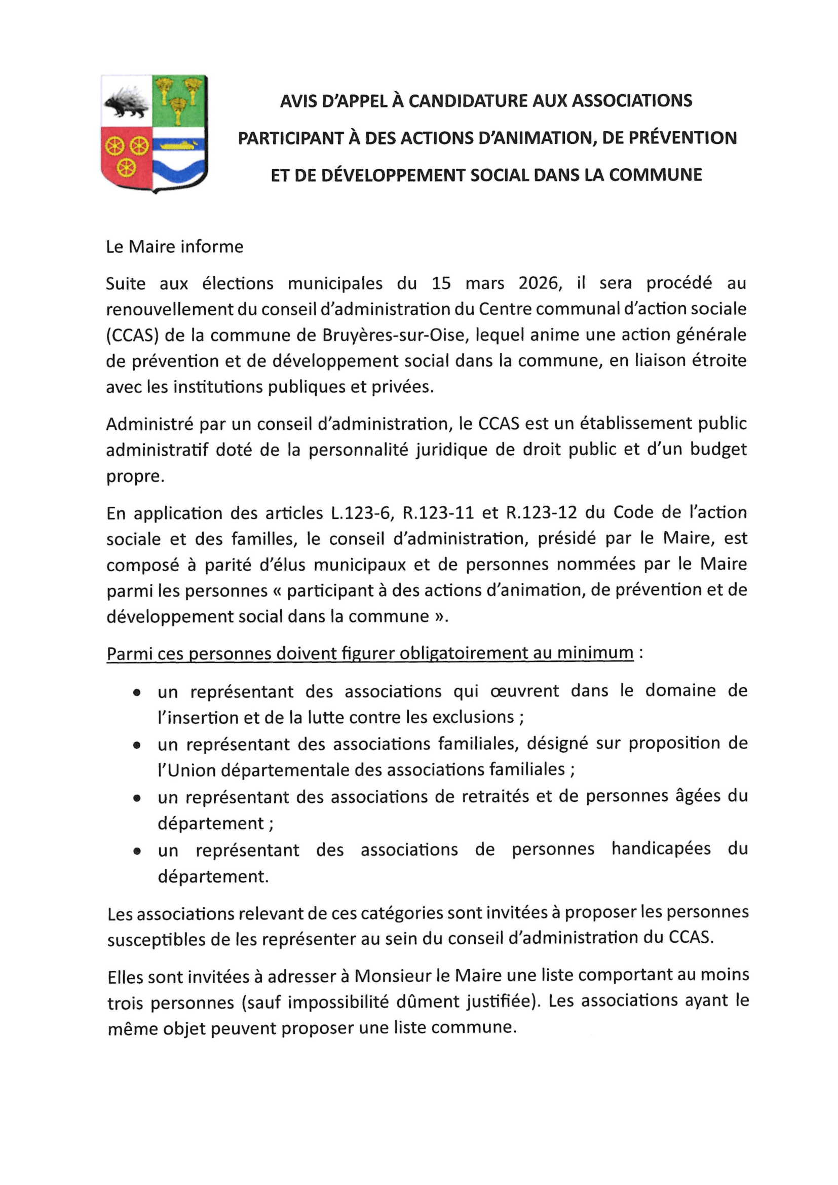 Avis d’appel à candidature aux associations Avis d’appel à candidature aux associations participant aux animations de prévention et de développement social dans la commune.Publié et affiché en mairie le 01/04/2026 AIT ISSAD Ahmed2026-04-01T16:35:59+02:00 Partagez cet article, Choisissez votre Plateforme! FacebookXRedditLinkedInWhatsAppTumblrPinterestVkXingEmail Articles similaires Chantier OPAC de l’Oise – Montage de grues à partir du 30 mars Galerie Chantier OPAC de l’Oise – Montage de grues à partir du 30 mars Conseil municipal – Mardi 31 Mars 2026 à 20h30 Galerie Conseil municipal – Mardi 31 Mars 2026 à 20h30 Conseil municipal d’installation 20 mars 2026 Galerie Conseil municipal d’installation 20 mars 2026 Le Coffre à histoires – 21 mars 2026 Galerie Le Coffre à histoires – 21 mars 2026 Conseil municipal d’installation – Vendredi 20 mars 2026 à 20h00 Galerie Conseil municipal d’installation – Vendredi 20 mars 2026 à 20h00