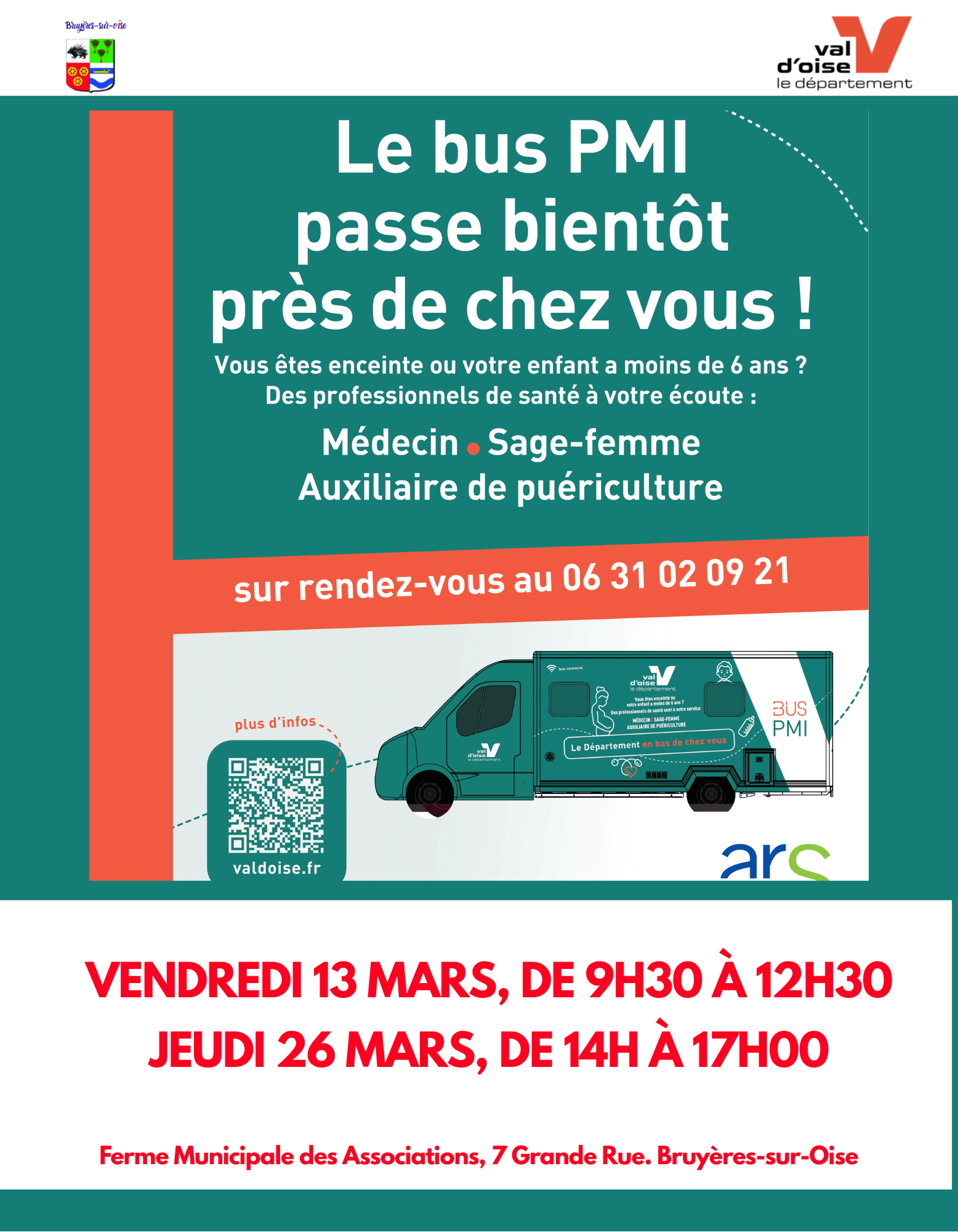 e bus de la Protection Maternelle et Infantile (PMI) du Conseil départemental du Val d’Oise sera présent à la Ferme Municipale des Associations (7 Grande Rue) pour des consultations gratuites destinées aux femmes enceintes et aux enfants de moins de 6 ans.