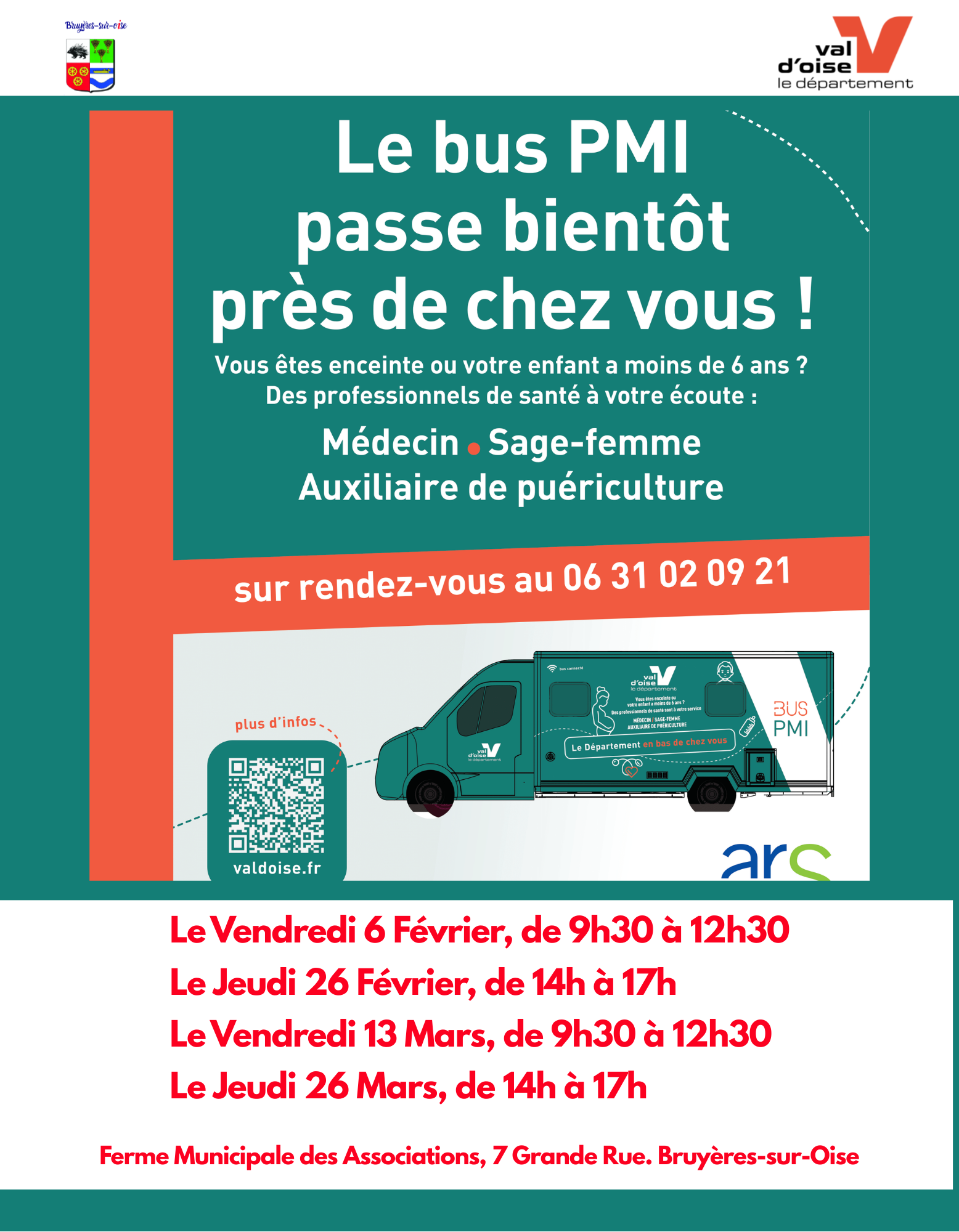 Les consultations se font uniquement sur rendez-vous au 06 31 02 09 21 (lundi au vendredi, 9h30-17h). Plus d’informations et flyer sur le site du Département : valdoise.fr/bus-PMI.