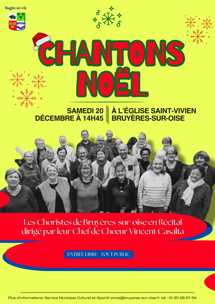 Le samedi 20 décembre à 14h45, ne manquez pas « Chantons Noël », un récital des Choristes de Bruyères-sur-Oise, dirigés par leur Chef de Chœur Vincent Casalta, à l’église Saint-Vivien. Ce spectacle musical s’inscrit dans la tradition des festivités de Noël et invite le public à célébrer cette période de l’année à travers le chant choral.
