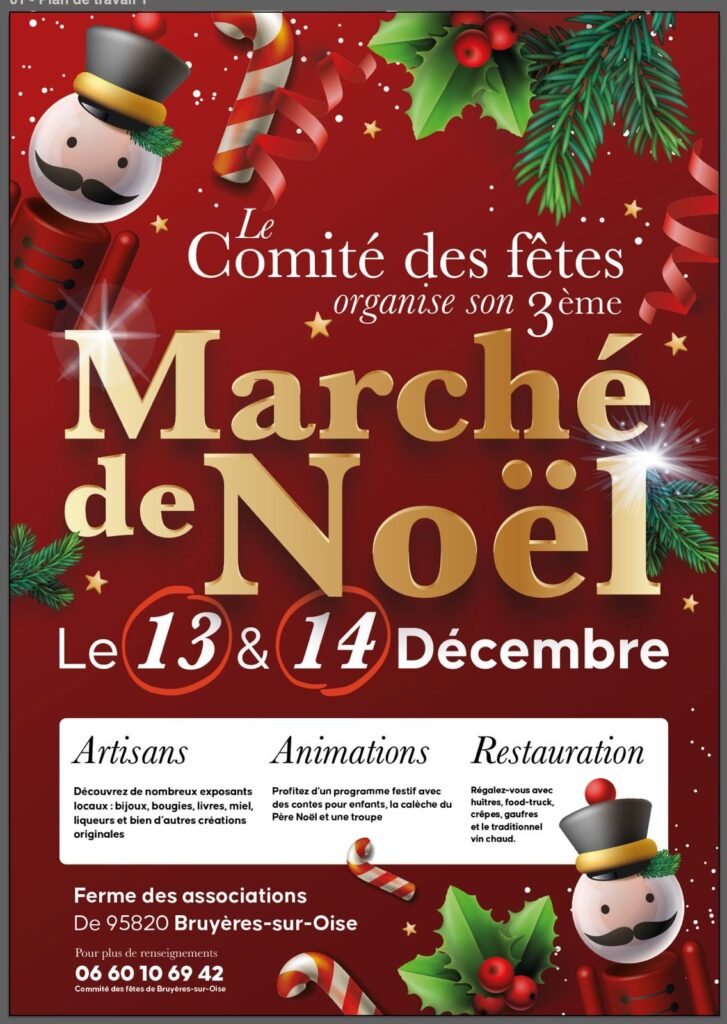Le Comité des fêtes de Bruyères-sur-Oise vous invite à son 3ᵉ marché de Noël les 13 et 14 décembre à la ferme des associations. Participez à ce week-end festif, ponctué par la présence de nombreux artisans locaux (bijoux, bougies, livres, gourmandises…), un programme d’animations avec contes pour enfants, calèche du Père Noël et troupe artistique, ainsi qu’une restauration variée, du vin chaud aux huîtres, crêpes et food-truck.