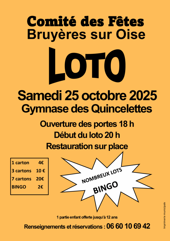 Le Comité des Fêtes de Bruyères-sur-Oise vous donne rendez-vous pour son grand loto annuel, le samedi 25 octobre au gymnase des Quincelettes.