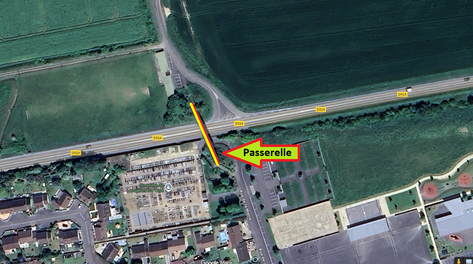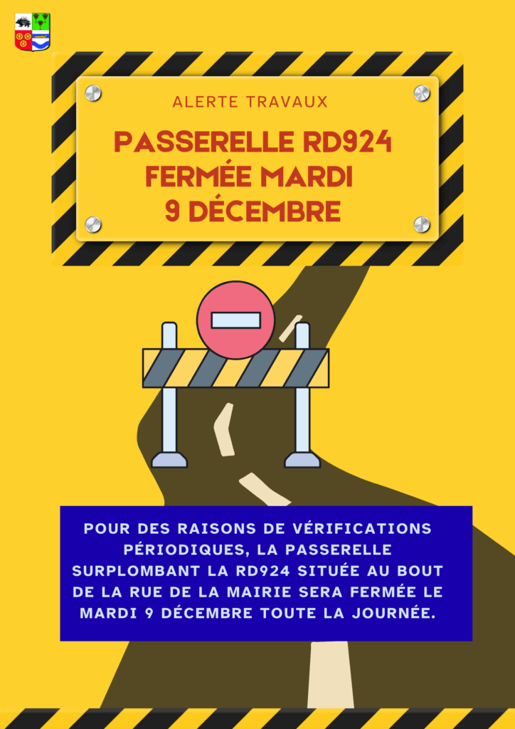 Dans le cadre des vérifications périodiques obligatoires, la passerelle qui surplombe la RD924, au bout de la rue de la Mairie à Bruyères-sur-Oise, sera entièrement fermée à la circulation le mardi 9 décembre, toute la journée. Les usagers sont invités à adapter leurs déplacements et à emprunter des itinéraires alternatifs si nécessaire.
