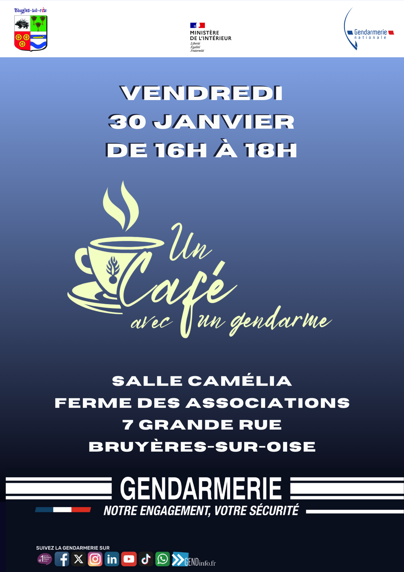 Dans le cadre de sa politique de prévention et de proximité, la Brigade de Gendarmerie de Persan, en collaboration avec la Commune de Bruyères sur Oise, organise l’opération « un café avec un Gendarme », un moment de rencontre et d’échanges entre les habitants et les forces de l’ordre.