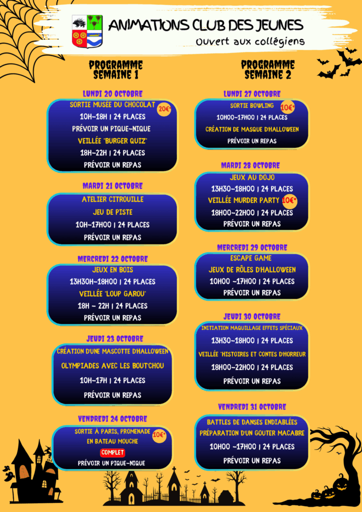 Le Club des Jeunes accueille les collégiens du 20 au 31 octobre 2025 pour un programme d’activités haut en couleur sur le thème d’Halloween !