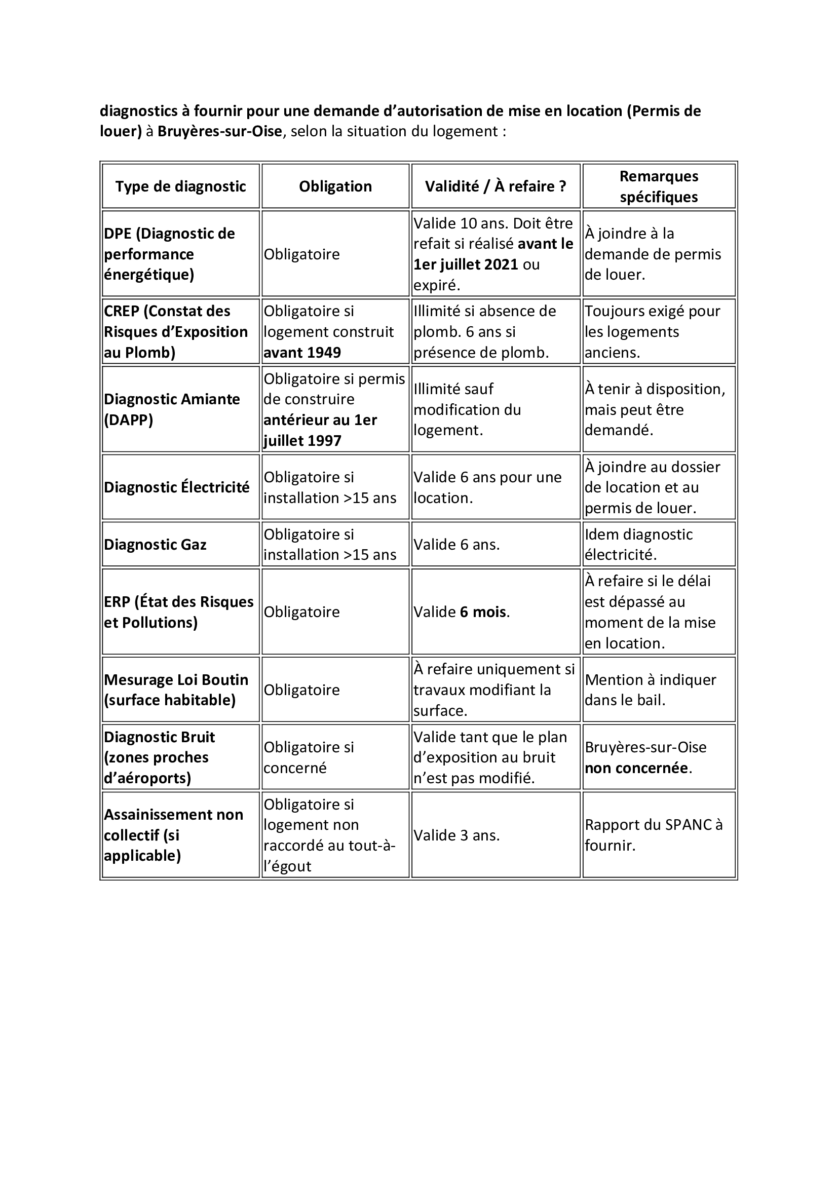 - Déposer ou envoyer par voie postale ou électronique ce formulaire dûment rempli, ainsi que le diagnostic technique, prévu à l’article 3-3 de la loi du 6 juillet 1989, à la mairie (au service urbanisme) ou à l’adresse : urbanisme@bruyeres-sur-oise.fr